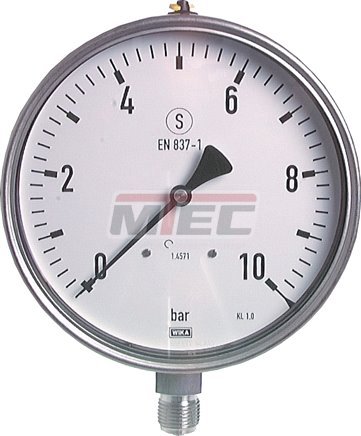 Verwendung: Manometer für besondere Sicherheit nach S 3 EN 837-1 (DIN 16006) mit ausblasbarer Rückwand und bruchsicherer Trennwand Werkstoffe: Gehäuse: 1.4301, Messsystem und Anschluss: 1.4404, Sichtscheibe: Mehrschichten-Sicherheitsglas Anschlussge
